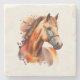 A stone coaster with a beautiful illustration. A copper brown chestnut coloured horse head and upper body. With watercolor patches behind.