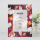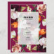 An elegant & fancy wedding menu design with a mix of beautiful summer flowers background on a magenta background and customisable black typography on a transparent white and gold frame background.