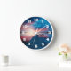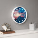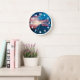 A clock with a gorgeous photograph. A scenic spot. A nice calm lake with a wooden dock stretching outwards. Setting sun provides beautiful colours in the sky, vibrant red and blue.
