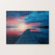 A puzzle with a gorgeous photograph. A scenic spot. A nice calm lake with a wooden dock stretching outwards. Setting sun provides beautiful colours in the sky, vibrant red and blue.