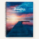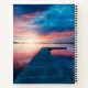Spiral notebook with a gorgeous photograph. A scenic spot. A nice calm lake with a wooden dock stretching outwards. Setting sun provides beautiful colours in the sky, vibrant red and blue.