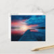 A postcard with a gorgeous photograph. A scenic spot. A nice calm lake with a wooden dock stretching outwards. Setting sun provides beautiful colours in the sky, vibrant red and blue.