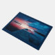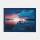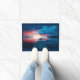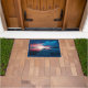 A welcome doormat with a gorgeous photograph. A scenic spot. A nice calm lake with a wooden dock stretching outwards. Setting sun provides beautiful colours in the sky, vibrant red and blue.