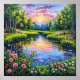 Painting of a beautiful sunset over a river with flowers