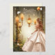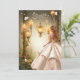 Beautiful Sweet 16 invitation with girl wearing a gorgeous gown standing by pretty glowing garden lamps in a forest. Sweet Sixteen text is done in a lovely silver.