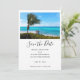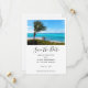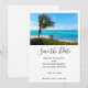 Save the date card with a scenic photograph. A clear blue ocean with a white sandy beach. A palm tree swaying in the wind.