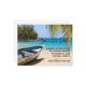 A wedding save the date postcard with an idyllic tropical beach scene. Turquoise blue crystal clear water and a soft brown sandy beach. Some palm leaves hanging down from above. An old wooden rowboat sits on the beach. A serene and peaceful landscape.