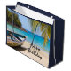 A birthday gift bag with an idyllic tropical beach scene. Turquoise blue crystal clear water and a soft brown sandy beach. Some palm leaves hanging down from above. An old wooden rowboat sits on the beach. A serene and peaceful landscape.