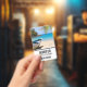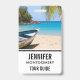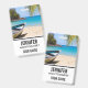 Name badge with an idyllic tropical beach scene. Turquoise blue crystal clear water and a soft brown sandy beach. Some palm leaves hanging down from above. An old wooden rowboat sits on the beach. A serene and peaceful landscape.
