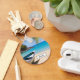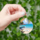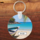 A personalized keychain with an idyllic tropical beach scene. Turquoise blue crystal clear water and a soft brown sandy beach. Some palm leaves hanging down from above. An old wooden rowboat sits on the beach. A serene and peaceful landscape.