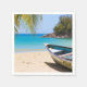 Paper napkins with an idyllic tropical beach scene. Turquoise blue crystal clear water and a soft brown sandy beach. Some palm leaves hanging down from above. An old wooden rowboat sits on the beach. A serene and peaceful landscape.