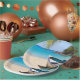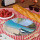 Paper plate with an idyllic tropical beach scene. Turquoise blue crystal clear water and a soft brown sandy beach. Some palm leaves hanging down from above. An old wooden rowboat sits on the beach. A serene and peaceful landscape.