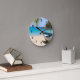 A clock with an idyllic tropical beach scene. Turquoise blue crystal clear water and a soft brown sandy beach. Some palm leaves hanging down from above. An old wooden rowboat sits on the beach. A serene and peaceful landscape.