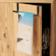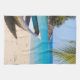 Kitchen towel with an idyllic tropical beach scene. Turquoise blue crystal clear water and a soft brown sandy beach. Some palm leaves hanging down from above. An old wooden rowboat sits on the beach. A serene and peaceful landscape.