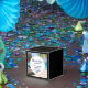 Tiny 2 inch x 2 inch wedding favour box with an idyllic tropical beach scene. Turquoise blue crystal clear water and a soft brown sandy beach. Some palm leaves hanging down from above. An old wooden rowboat sits on the beach. A serene and peaceful landscape.