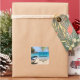 Save the date wedding stickers, perfect for envelope seals. Designed with an idyllic tropical beach scene. Turquoise blue crystal clear water and a soft brown sandy beach. Some palm leaves hanging down from above. An old wooden rowboat sits on the beach. A serene and peaceful landscape.
