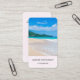 Business cards with a photograph of a gorgeous vacation location. Bright blue sky, soft sandy beach with tropical crystal clear blue waters. A lush tree covered mountain in the background. Scenic and tranquil photography.