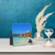 A photo plaque with a photograph of a turquoise blue ocean beach with big rocks scattered along the coast. Bright and sunny tropical locale.
