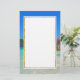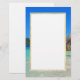 Stationery paper with a photograph of a turquoise blue ocean beach with big rocks scattered along the coast. Bright and sunny tropical locale. A white rectangle with a faux gold foil border layered over top to write inside.