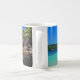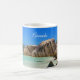 A mug with a photograph of a turquoise blue ocean beach with big rocks scattered along the coast. Bright and sunny tropical locale.