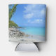 Can cooler with a scenic tropical photograph. A secluded beach with white sand and turquoise water.