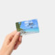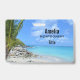 Name badge with a scenic tropical photograph. A secluded beach with white sand and turquoise water.