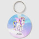 A key chain with an image of a unicorn with big blue eyes, pink wings and a rainbow mane and tail. Kawaii cute.