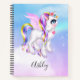 A personalised spiral notebook with an image of a unicorn with big blue eyes, pink wings and a rainbow mane and tail. Kawaii cute.