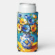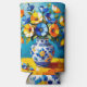 Beautiful can cooler with a beautiful impasto style ai illustration of blue and orange flowers in a fancy vase.