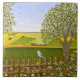 A ceramic tile with a beautiful image of a nature scene: A bird sitting on a weathered fence, wildflowers growing around the fence, a farmer on a tractor, working his land, trees with leaves, and farmland with various colors. Original artwork by W.B.