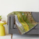 A fleece blanket with a beautiful image of a nature scene: A bird sitting on a weathered fence, wildflowers growing around the fence, a farmer on a tractor, working his land, trees fall leaves, and farmland of various colors. Original artwork by W.B.