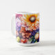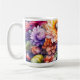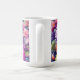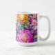 Pretty watercolor floral coffee mug. Peonies and other flowers in peach, coral, purple and purple.