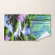 This graphic is a beautiful, lush forest with an elegant waterfall pond. The light blue flowers, light pink and lilac flowers, ferns, green trees, flora, and fauna create a stunning natural landscape. This hand towel adds colour and action to the bathroom.