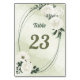 Beautiful botanical table number card featuring romantic white flowers with romantic dark green leaves on a pretty geometric frame.