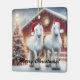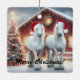 Beautiful White Horses wearing a santa hats with a lighted Christmas tree and rustic red barn Ceramic Ornament