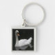 This awesome keychain features a photograph of a beautiful white swan. The swan is a male mute swan, you can tell it is male by the black bump on the beak. The swan is gliding gracefully across the water on a calm lake.