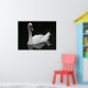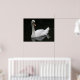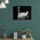 This poster features a photograph of a beautiful white swan. The swan is a male mute swan, you can tell it is male by the black bump on the beak. The swan is gliding gracefully across the water on a calm lake.