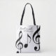 A beautiful white tote-bag with black and graphic musical notes, personalised with your name