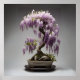 This enchanting poster captures the serene beauty of a bonsai wisteria tree in full bloom. The meticulously crafted miniature tree stands proudly at the centre, its elegant branches draped with cascades of delicate purple flowers that seem to glow against the soft, warm background. Each carefully tended leaf and petal is a testament to the art and patience of bonsai cultivation, inviting the viewer into a tranquil world where nature's grace is magnified in miniature.