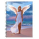 Notebook in a portrait of a beautiful woman in white, the wings of an angel, on a beach at dawn