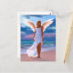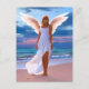 Postcard in a portrait of a beautiful woman in white, the wings of an angel, on a beach at dawn