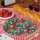 This beautiful flowers in yellow, blue, and red botanical print is perfect for a spring aesthetic party. Matching napkins are available. AI assisted graphic purchased with commercial use. Artwork: PaperiArt