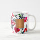 Luxurious classy glamourous business professional personalised coffee mug with a pattern featuring big hand painted watercolor coral red burgundy and blush pink peonies and blooms with deep ocean blue foliage boho bouquets and two shiny beige tan copper metallic geometric labels. Ideal for beauty salon | makeup artist studio | hairstylist | fashion stylist | home interior decorator | designer | architect | fashion boutique owner | boss lady. ------- Perfect choice for a stylish sophisticated business image. ----- Personalise it with your business name / your name inside the squares on left and right!