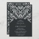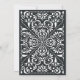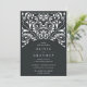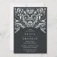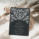 Elegant vintage wedding invitations in rich charcoal off-black feature ornate detailing that evokes the look of cut paper in a papel picado style.