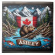 A beaver constructs a dam in a vibrant river, surrounded by mountains and a Canadian flag, showcasing natural habitat in a scenic landscape.