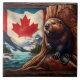A beaver sits on a tree trunk beside a river, framed by a stunning landscape of mountains and the Canadian flag in the background.