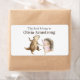 Whimsical watercolor illustration features dancing beaver and hedgehog. Personalised name in brown font