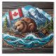 A Canadian beaver sits on a raft made of sticks, surrounded by water and mountains, with a flag waving in the background.