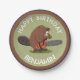 This happy beaver is ready to build his lodge with a chainsaw. Drawn in fun cartoon illustration style for a party!