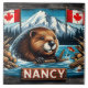 A Canadian beaver is playfully holding a stick, surrounded by mountains and Canadian flags, capturing the essence of nature and national pride.
